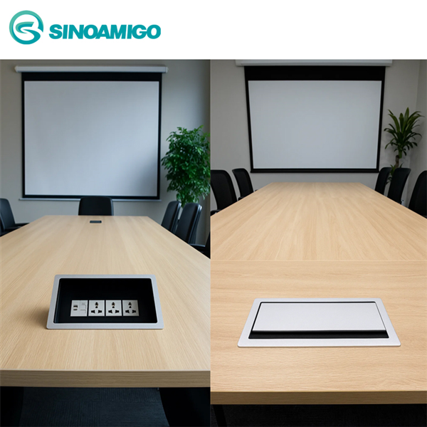 Hộp điện âm bàn nắp lật hai bên sinoamigo STS-7S/F4 với Thiết kế âm bàn thẩm mỹ cao: Giúp che giấu ổ cắm khi không sử dụng, giữ cho mặt bàn luôn gọn gàng, sạch đẹp.