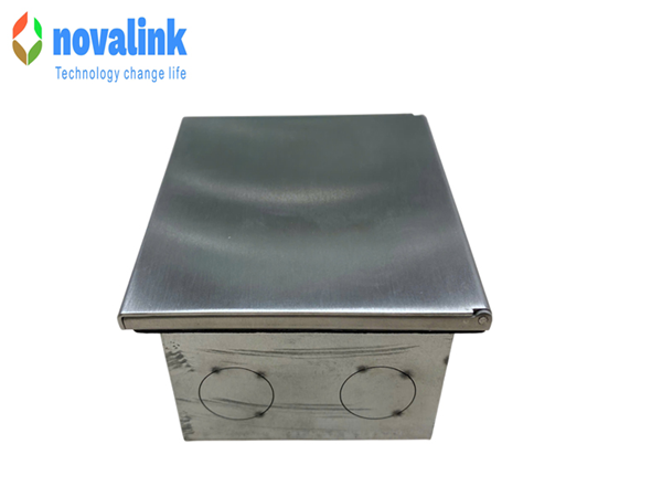 Mặt ổ điện được gia công từ thép không gỉ giúp hạn chế trầy xước và chống oxy hóa trong môi trường sử dụng lâu dài. Khung hộp âm sàn cứng cáp hỗ trợ bảo vệ hệ thống dây dẫn và thiết bị kết nối bên trong.